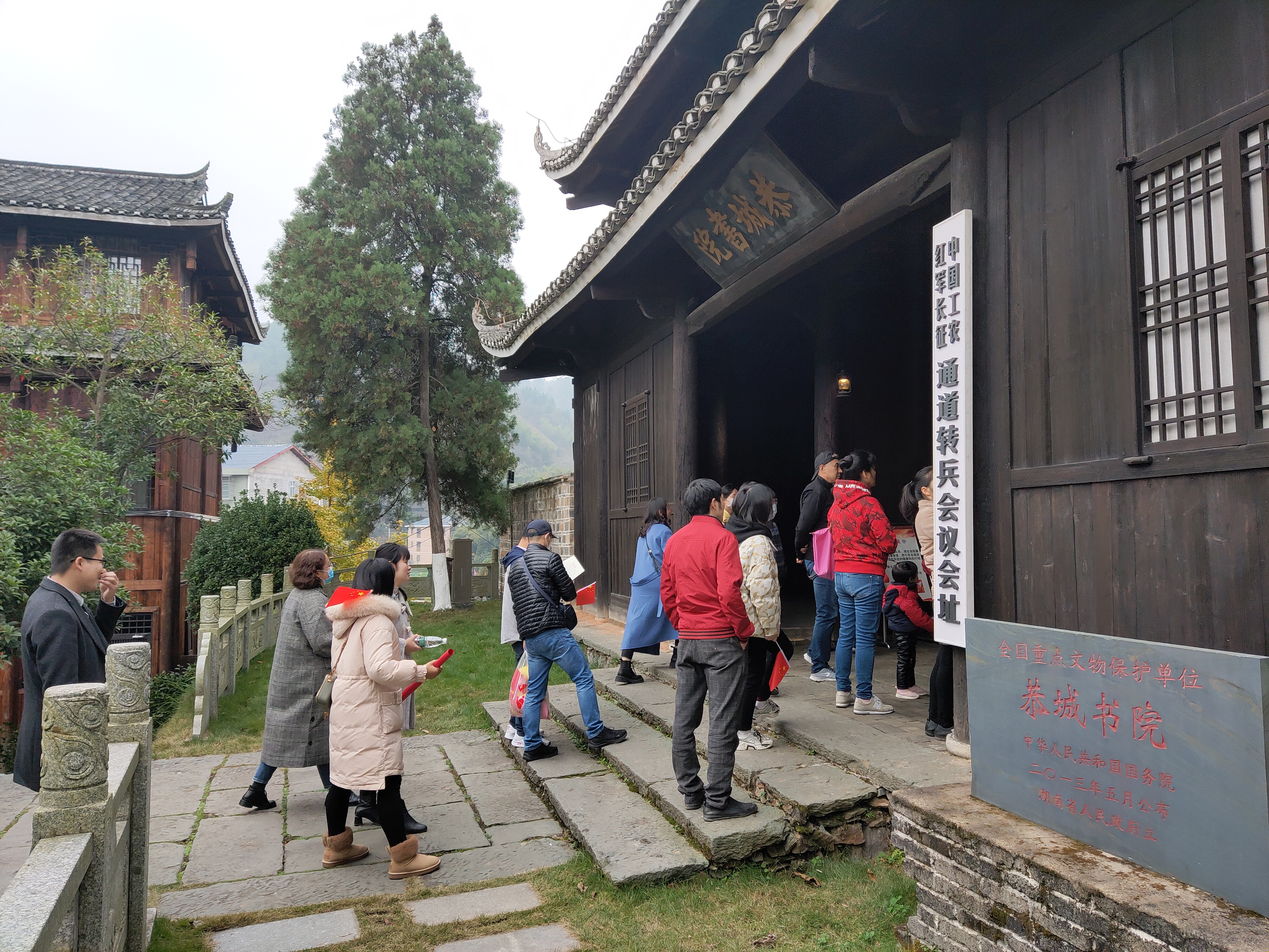 随后,全体党员在讲解员带领下来参观了通道会议旧址恭城书院。恭城书院始建于宋,清乾隆年间重修。2010年5月,被授予为湖南省国防教育基地。书院为纯木结构建筑群,仍保存较为完好。1934年12月12日,恭城书院内气氛压抑,一次关系中国革命前途的临时紧急会议就在这里举行。会议根据大多数人的意见,通过了毛泽东的主张。这是第五次反“围剿”以来,毛泽东第一次在中央有了发言权,也是他的意见第一次得到中央多数同志的赞同。当晚7时半,中革军委向各军团、纵队首长发出西入贵州的“万万火急”电令。同年12月13日,中央红军在通道境内突然改变行军路线,分两路转兵西进:一路进入靖县的新厂、平茶,然后分两路向贵州进军;一路进入贵州洪州,向黎平挺进。通道会议后,绝处逢生的红军自此处处有“通道”。随着长征历史研究的深入,通道会议和通道转兵的重大意义也得到应有的历史评价。