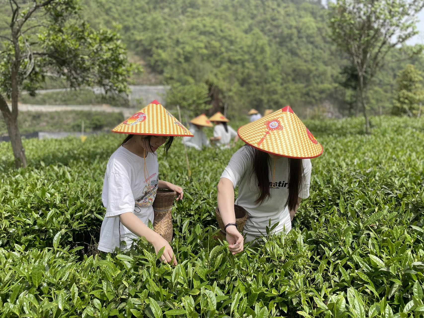骄阳炽盛,茶山如卷。辽阔晴空下,层层碧浪接天远,新芽凝露,翠色欲滴。学子们身挎竹篓,踏青石板阶梯徐行,在茶园田垄间穿梭,躬身俯首指尖轻触嫩芽,一捻一提间,茶香染袖,恍若“掬水月在手,弄花香满衣”。“一片芽配两片叶,但一定不要图方便用指甲掐”,采茶基地师傅如是提醒,并示范;同学初来上手还觉得陌生,多次尝试也是熟能生巧,在颇显闷热的天气里发现未曾体验的乐趣……夕阳西沉,茶山逐渐归于寂静。归途大巴上,同学们依靠在座椅宽大的靠背上,指尖残留着草木汁液的清香,不时谈及个中体验,脸上洋溢着淡淡笑容,亦是觉得不虚此行。